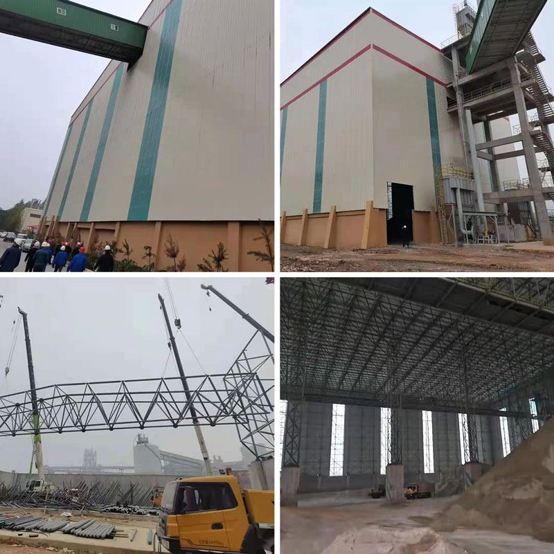 矿渣堆棚及高镁石库网架,总建筑面积11586㎡,屋脊高32.8米,属平面网架,用钢量约1000吨。
